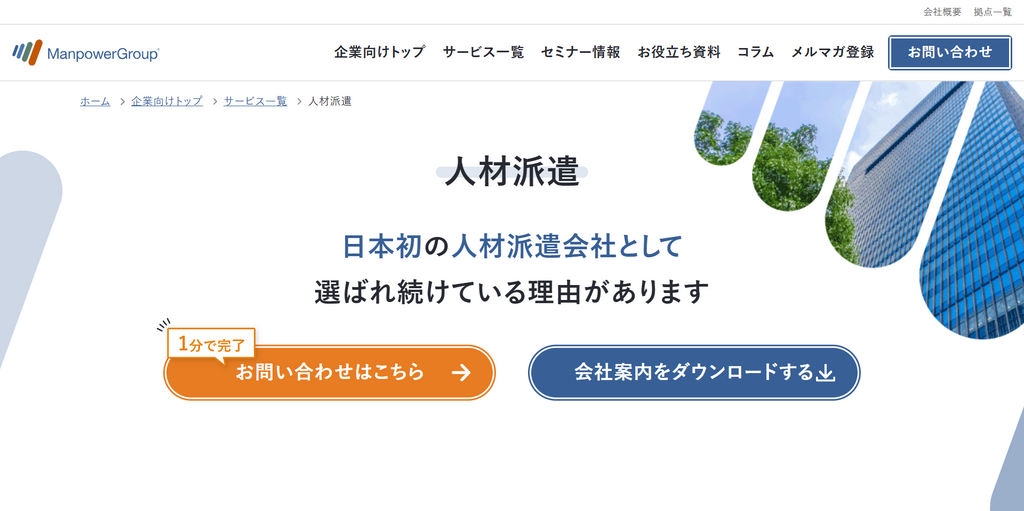 マンパワーグループは日本で最初に人材派遣サービスを開始した会社です。50年以上の歴史と実績があり、優良派遣事業者にも認定されています。